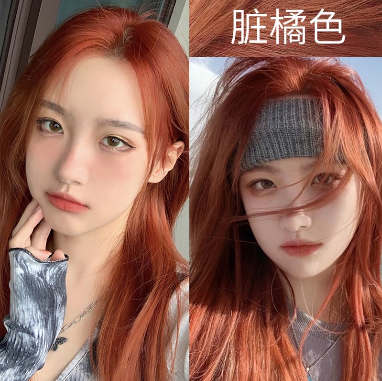 脏橘色,顾名思义“脏”字是操作关键。橘色本身就很有活力,偏粽的“脏”感让它变得更日常,显得特别少女。脏橘色没有橘色那么靓丽,颜色稍微偏暗,深发色也是可以染的,它是一种暖色调,非常适合在冬季染,能让肤色更加白皙,可以搭配各种妆容。脏橘色看起来就像是橘色,但是色调比亮橘色要暗一些,但依旧有十分温暖的感觉,相比于亮色系更加百搭,在视觉上也有着极佳的显白效果,所以基本上不挑肤色,黑黄皮也可以放心大胆地染这款颜色。