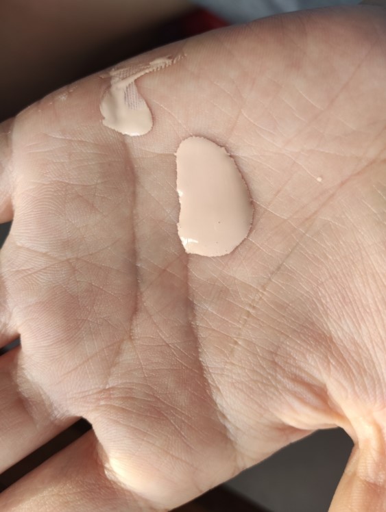 这款粉底液属于乳状质地,按压在手背后感觉比较稀薄,很容易被推开,味道不刺鼻,在刻度尺的0刻度处挤出0.1mL的产品,用指腹往后涂开,观察产品能够延展的长度。产品经涂开后延展的长度越长,表明延展性也好,使用的时候更容易推开和均匀涂抹。