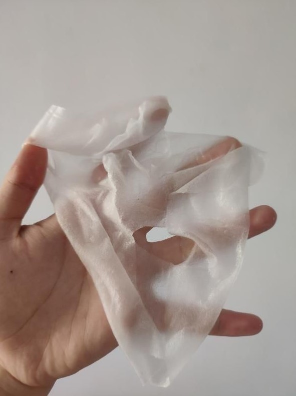 面膜纸很薄很薄,薄到可以看到我额头上的大痘痘啊,绵密拿出来时两片一片蚕丝面膜,另一片厚一点的事锁住精华的,挤出来的精华满满得都是,面膜袋子里就没有什么精华了,面膜精华有一点黏,建议洗掉,洗完了以后脸上皮肤摸起来很嫩,很水润,并不是那种假假的滑溜溜的感觉。