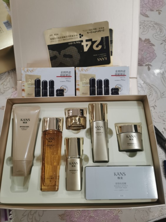 我妈妈用了一周水和乳bb,很清透滋润,水带金箔的效果很好,bb霜很滋润,很自然的白,送的小样也是超多,整套下来非常实惠。