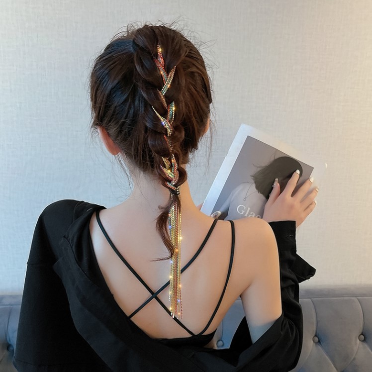6.把辫子一直编织到最后发端位置。然后用梳子稍微倒梳,扎上小橡皮筋。