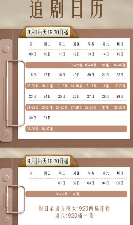 《理想之城》8.12起每晚19:30《理想之城》两集连播(周六一集);《扫黑风暴》每周一至周五晚21:10播出一集,每周六20:20播出一集。
