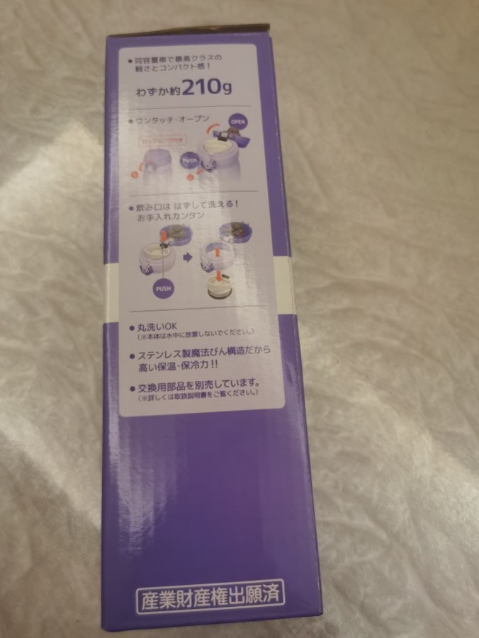 紫色的很美很漂亮,很喜欢又轻又保温,保温时间很长,出门带着也方便,而且很轻便,跟在日本买的一样,白色还带有珠光,保温杯还是膳魔师。