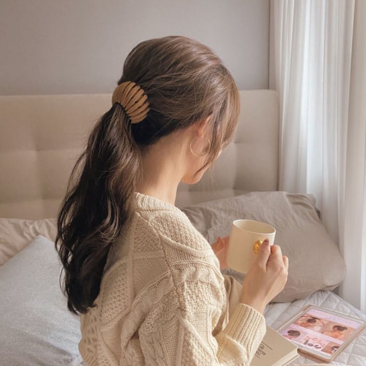 step 2:用橡皮筋将马尾固定住,再轻轻将头顶的头发往上提拉,让蓬松效果更明显。(PS:配上一个简约的发夹或者用好看的发圈也可以,遮盖一下扎发位置的橡皮筋,会更美。
