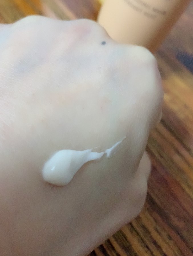 挤出来在手背上是米白色膏体,与润燥精华比较浓郁的药味相比,与润有淡淡的药香味。推开后立刻变成乳液一般,滋润却不油腻。拍照看起来似乎是油光,实际上是水润感。推开后过了5分钟,油光感消失。手背上擦了面膜的区域,光泽度和滋润度都有提升。