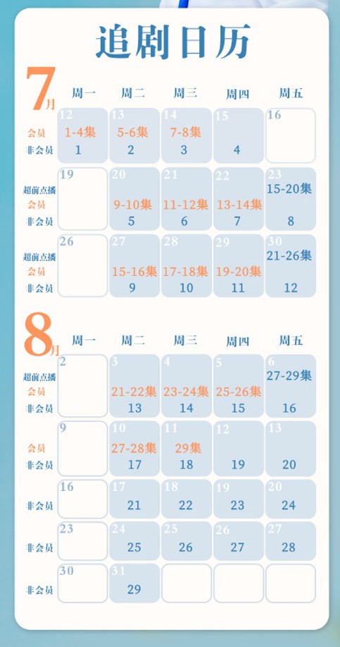 VIP会员首周周一更新4集,周二至周三更新2集,次周起每周二至周四12:00更新2集。非会员首周周一至周四每天更新1集,次周起周二至周五更新1集。