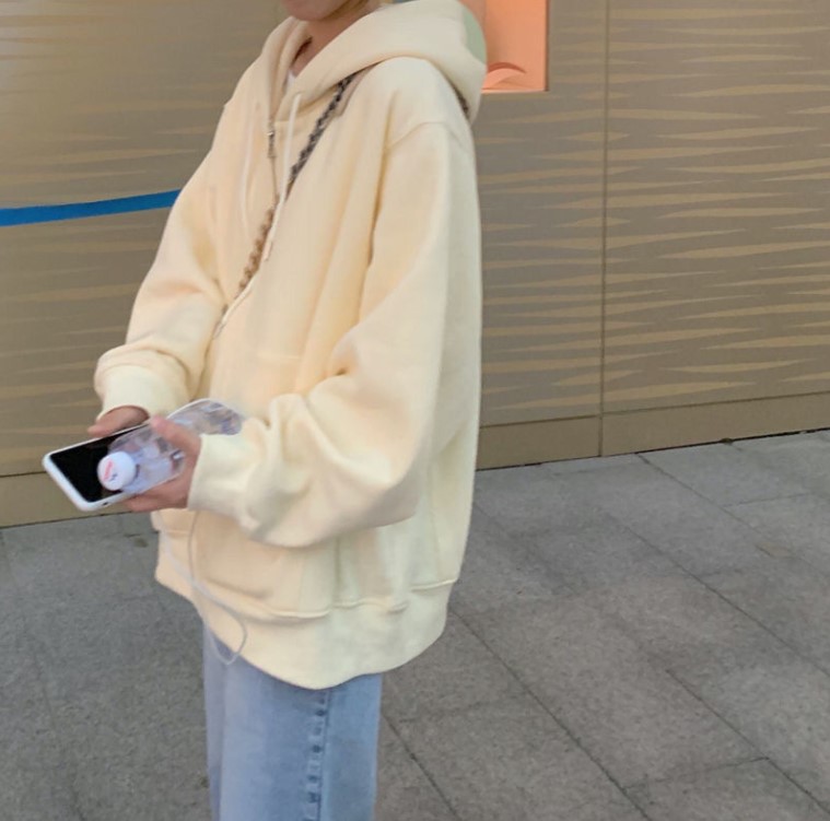 蓝色牛仔裤是衣橱必备的单品,休闲时尚又极其百搭。黄色连帽卫衣内搭白色T恤,清新休闲又十分少女,下身搭配蓝色紧身牛仔裤和小白鞋,满满的青春活力。