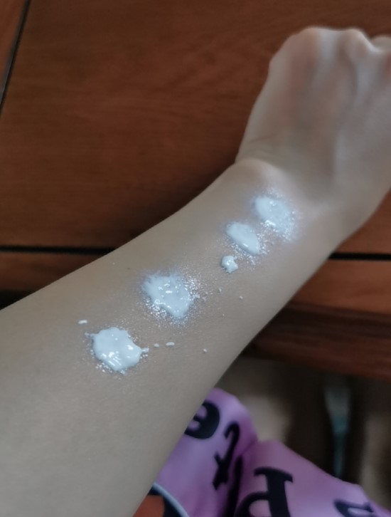 喷在身上之后均匀涂抹开来,涂开不假白,也没啥明显的润色效果,孩子用着也挺合适。