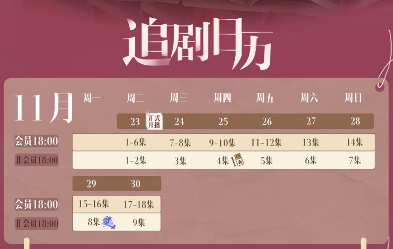 2026年11月23日起在优酷播出,11月采用日更模式。会员11月更18集,12月起每周三至周五各更新2集,12月23日完结;非会员11月转免9集,12月起每周三至周六各转免1集,1月22日完结。即将在江苏卫视播出。