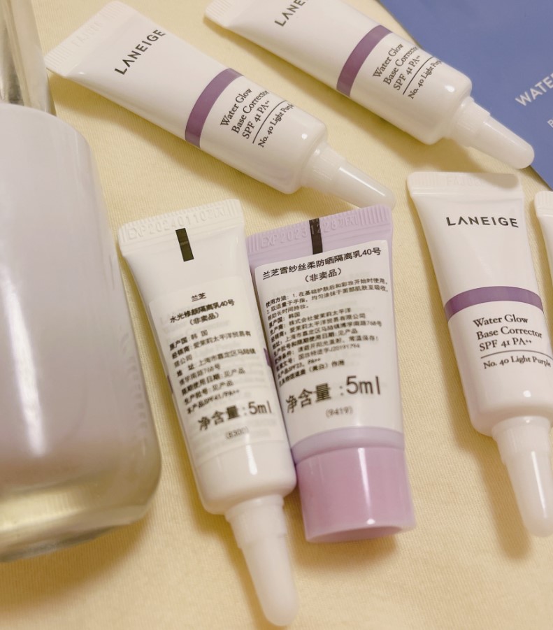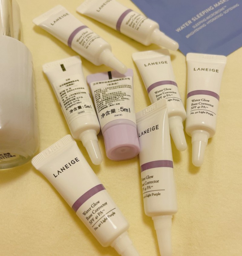 买这款兰芝水光修颜隔离霜还送了很多小样,水光隔离紫色可以修正脸上的暗黄,流动性很强 比较润,混干皮用起来感觉很不错!