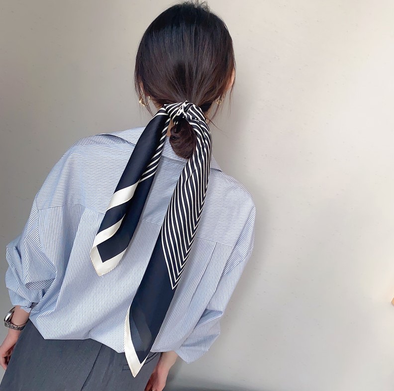 丝巾除了可以拿来绑头发之外,还可以围在脖子上或者绑在手上也是很好的搭配方法,或者我们在背包包的时候也是可以将丝巾绑在包包上作为装饰的一种方法。