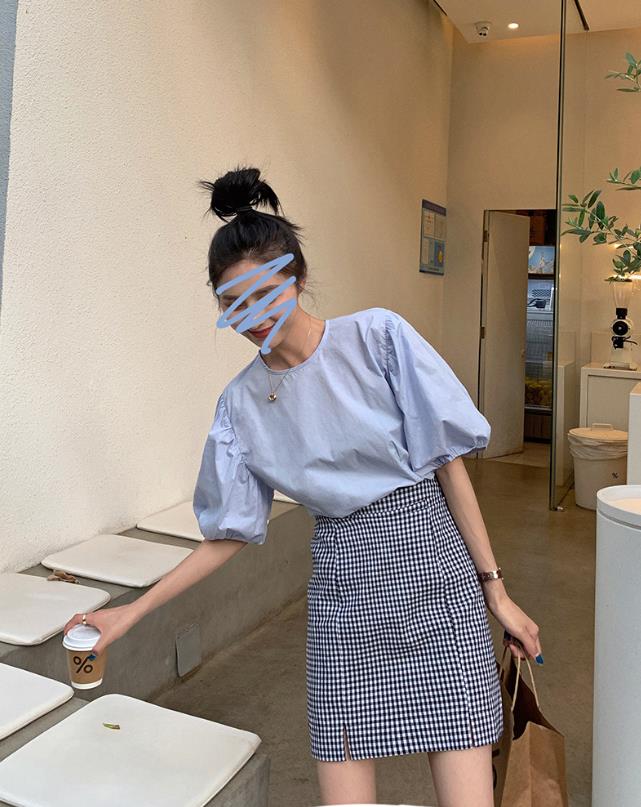 我们遵循“塞一半留一半”的方法,选择条纹衬衫加上“A”字短裙,先将衣摆前面一半衣服扎在短裙里面,后面一半垂下来,然后将前面的衣服整理出来一点,宽松一点即可,这种穿衣方法,从视觉上看,超级显腿长,同时后面还可以遮住屁股,短裙对梨型身材的女生非常友好,看似随意的穿衣方法,实则小心机。