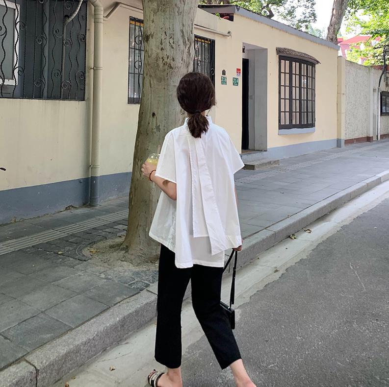 2.衬衫材质不同,穿出的感觉和效果完全不同,宽松的衬衫配一条短裤,全部塞进去后,在轻轻把整个衬衫往外拉一下,让衬衫於出来有一种小清新的感觉。