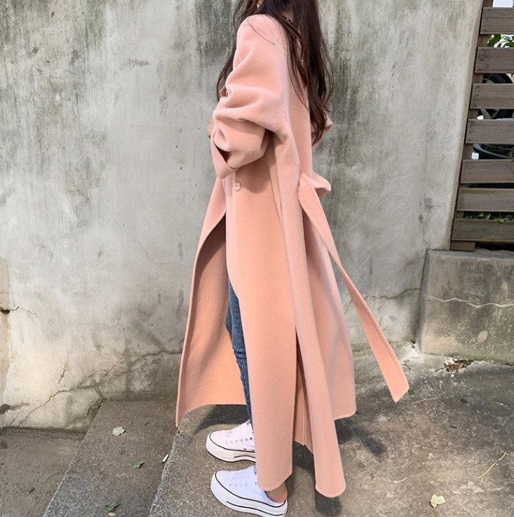 粉色大衣配大地色系内搭带来青春活力的感觉,大地色系的温暖感配上粉色的甜美感让你看起来优雅十足。