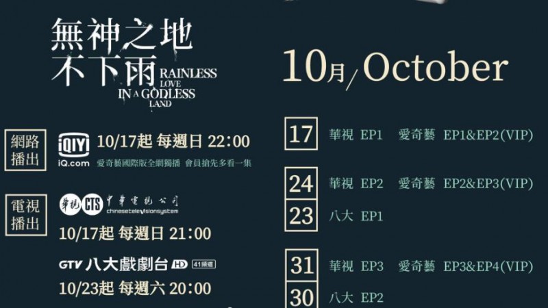 《无神之地不下雨》将在爱奇艺台湾站播出,由曾之乔、傅孟柏、颜毓麟、柯佳嬿、郑元畅等主演。