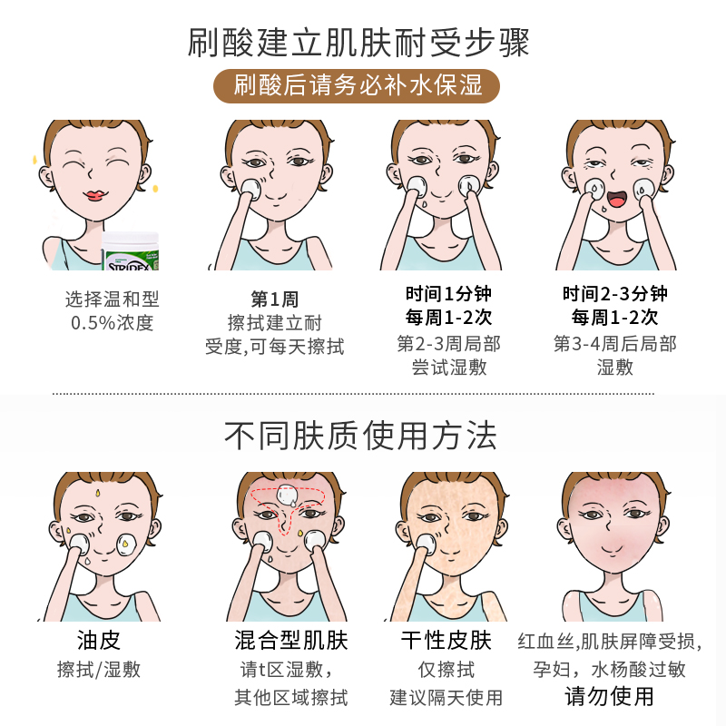 刷酸效果明显但一定不可贪心,刷酸会给肌肤带来明显的改变,但是频率过快,会导致皮肤受损。水杨酸,对黑头闭口粉刺非常有效。A酸对大闭口,脓疱丘疹甚至鸡皮肤有疗效,不过这是药物,最好有医生指导使用。壬二酸,TO有这个,美白消炎,痘痘肌可以用,不过相对温和,没有那么明显效果。果酸,3%可以保湿,4%可以剥落角质层。大浓度果酸会给皮肤造成伤害,皮肤变薄甚至灼伤。刷酸前四天,化妆棉浸湿,在洁面后局部擦拭。如果特别敏感,隔一天用一次,之后正常护肤,着重保湿。如果无异常感觉,可以每天局部湿敷,十分钟之内。一般以半个月到二十天为一个周期,如果提前达到效果,可以停止,最长不要超过二十天。油痘皮可以在时间范围内刷酸,干皮在十五日以内最好。两次刷酸至少间隔一个月。