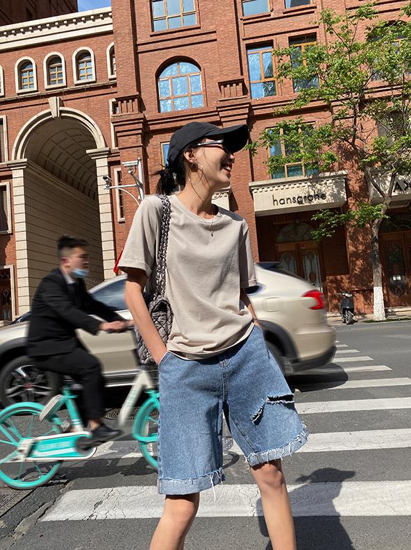 3、休闲短袖搭配宽松牛仔短裤。牛仔系列的衣服是人们经常选择的,宽松版的短裤可以捎带搭配一款宽松版的上衣整体给人一种休闲的感觉。