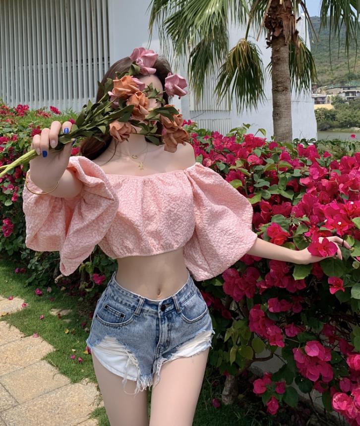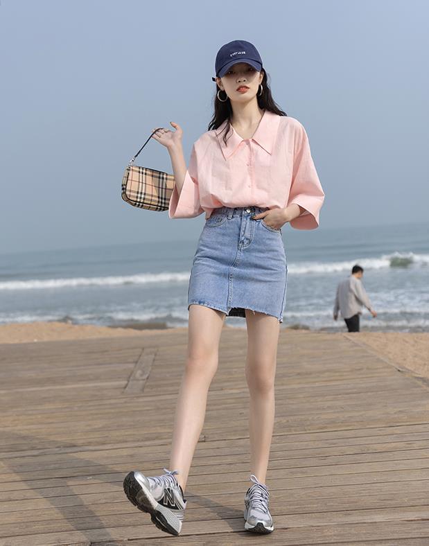 牛仔短裤是女生们夏季必备的单品哦-清凉又时尚,随意搭配一件T恤或者衬衫,就能穿出休闲时尚的夏日风。粉色衬衫搭配浅蓝色牛仔短裤,清新又甜美。