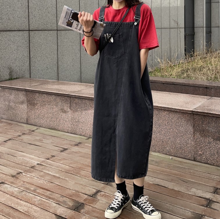搭配看点:线条简洁的牛仔背带裙搭配黑色T恤十分显瘦,鞋子也选择黑色款让造型更加出众