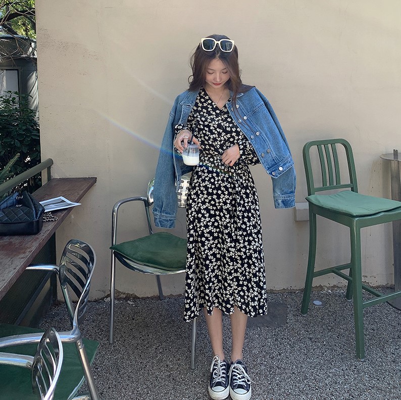 一条半身的碎花长裙配一件牛仔上衣,淑女又有范儿,又有气质。