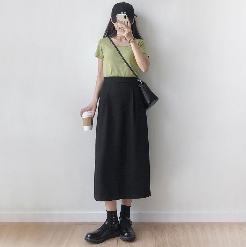 半身裙+短袖:不过在穿搭的时候需要注意一个小细节:把短袖掖进半身裙里面,不要为了方便省事儿把短袖直接按照平时穿衣服那般随性为之,用短袖压着下半身裙装的腰线处位置。