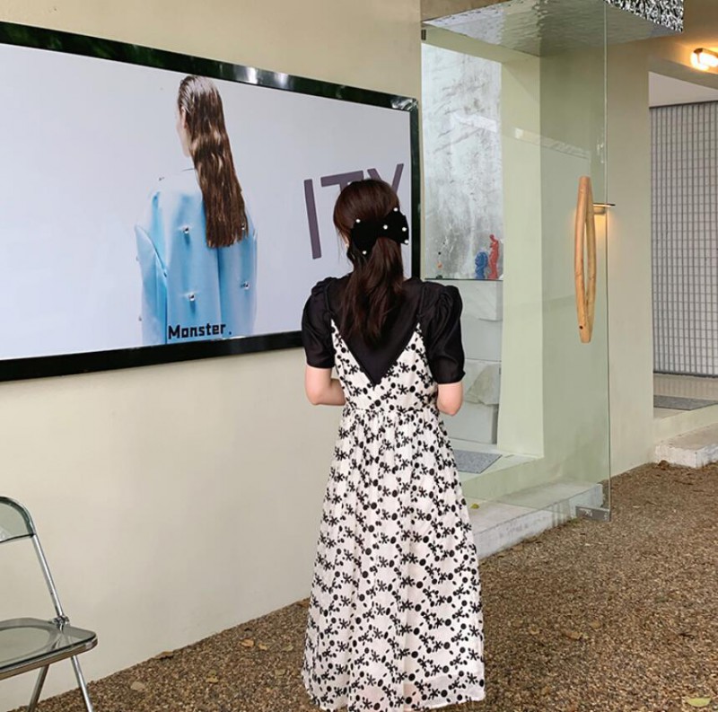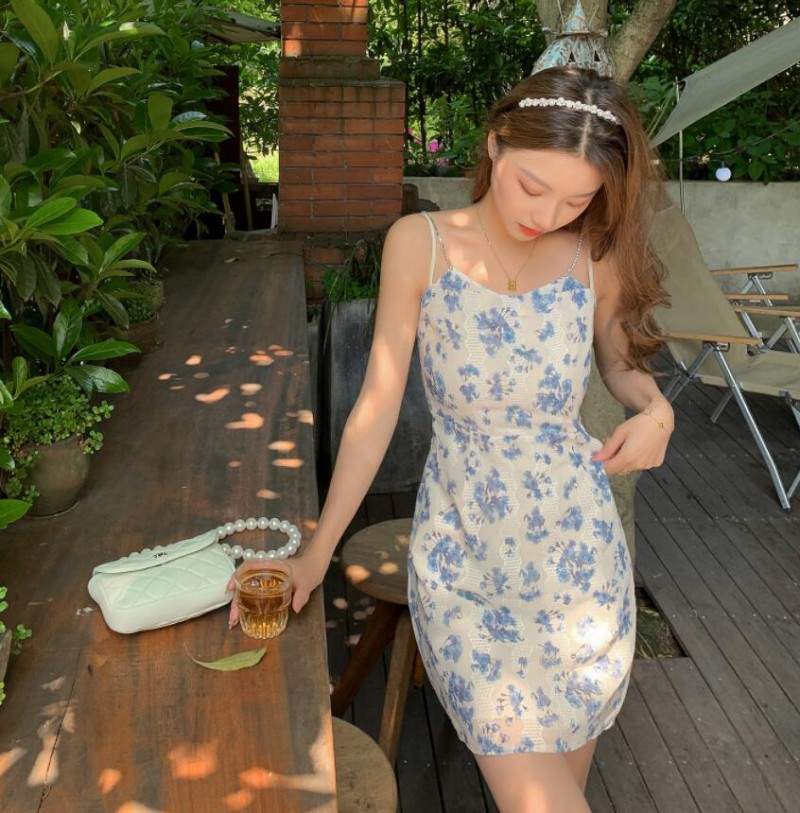 2、蓝底红花,清新的田园风,也是近年大热的浪漫花色。胸部设计有弹力橡筋,完美凸显玲珑的身段。其超强的弹力效果让裙子还可当半身裙穿,满足不同的搭配需求。褶皱下摆更显摇曳多姿。