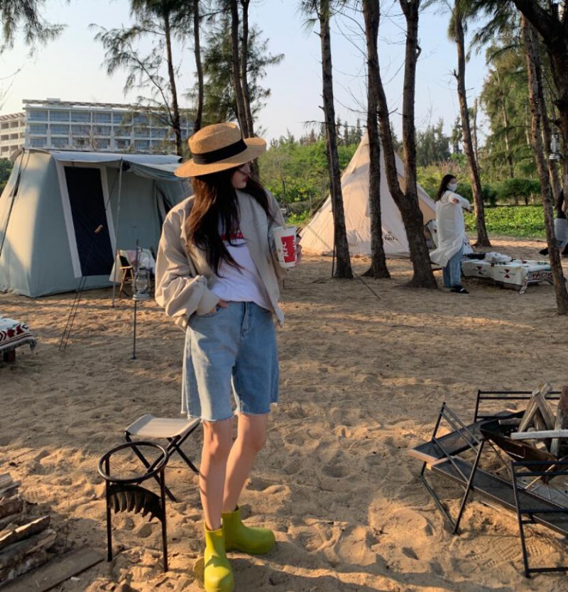 蓝色短裤如果选择碎花或是彩色的上衣,为了让上身颜色的比例减小。可以尝试背心或是将上衣扎进裤子,这样能减小上身的存在感。或者选择更加长的上衣减小裤子的存在感。