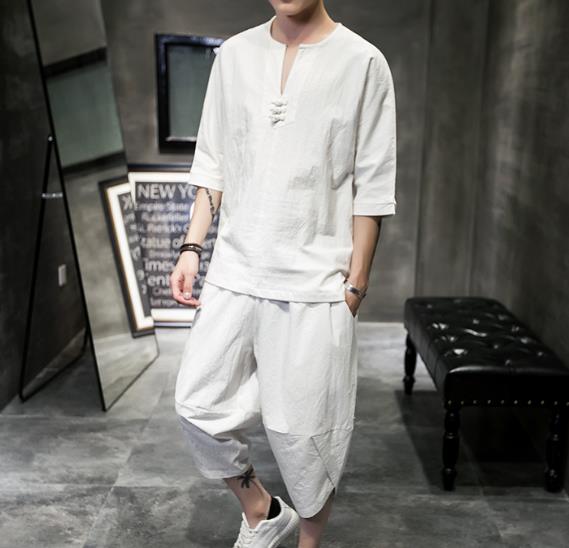 搭配1:男士灰色亚麻七分裤+中国风盘扣亚麻短袖衬衫