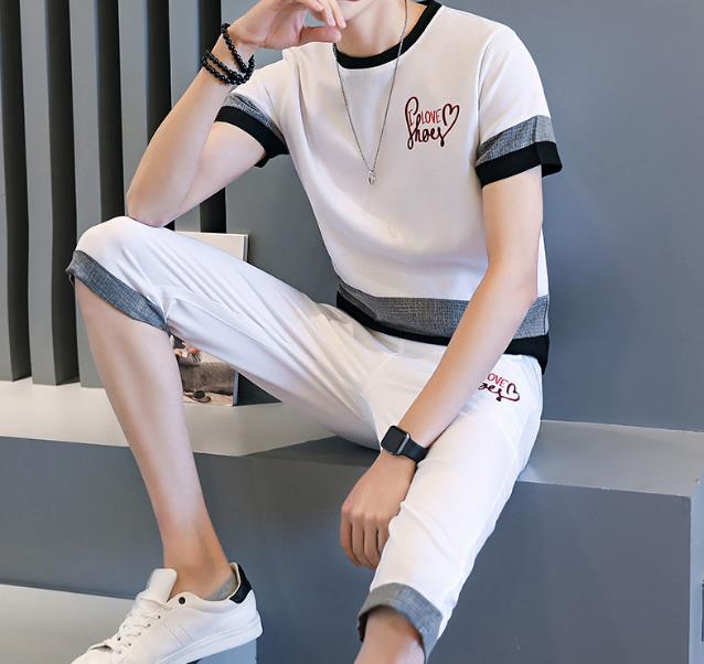 搭配2:纯棉休闲七分裤+黑色圆领印花短袖T恤
