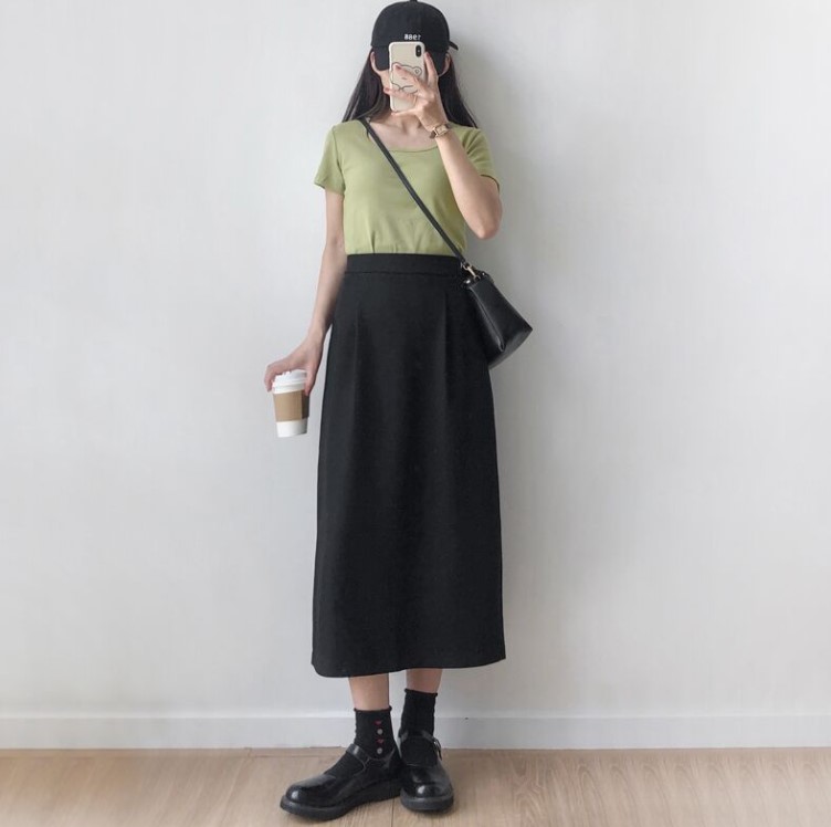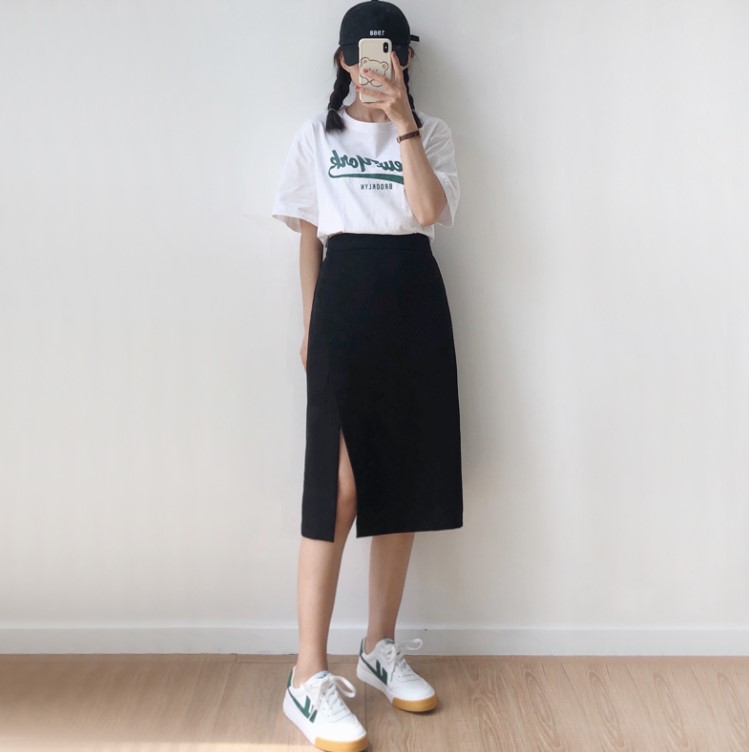 黑色裙子这个颜色本事就是比较百搭的颜色,所以搭配上衣可以根据自己喜欢的颜色去选择,如果年龄稍微大一些的话就不太适合穿一些鲜艳的颜色,可以选择白色、深色系的颜色。