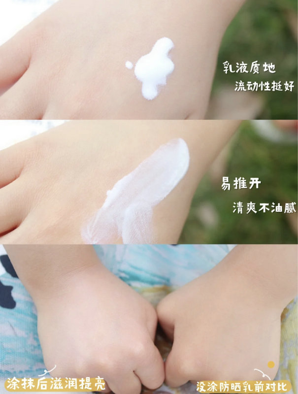 使用前可先摇晃一下,说真的,我超喜欢它的乳液质地,流动性不错推开后成膜快,很清爽一点都不油也不会闷痘,淡淡的香味也很好闻。在出门前给宝宝全身外露部位涂上,回到家之后再用温水或者温和沐浴露清洗即可,不需要卸妆哦,晒红的部位再涂一些镇定凝胶就可以的。