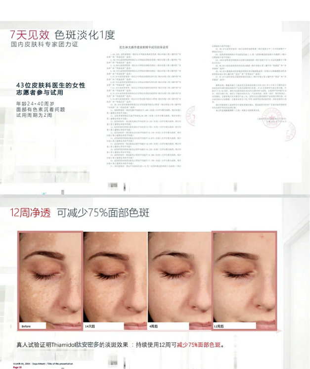 看上去是个猛药,但它其实很安全,不像烟酰胺和维C那样,要慢慢建立耐受,敏感肌也可以放心用。另外,还有一个黑科技成分「小甘草」,可以抵御光损伤,不让炎症去刺激黑色素细胞,预防黑色素的生成。它和肽安密多搭配在一起,直接从源头抑制了我们变黑的可能。