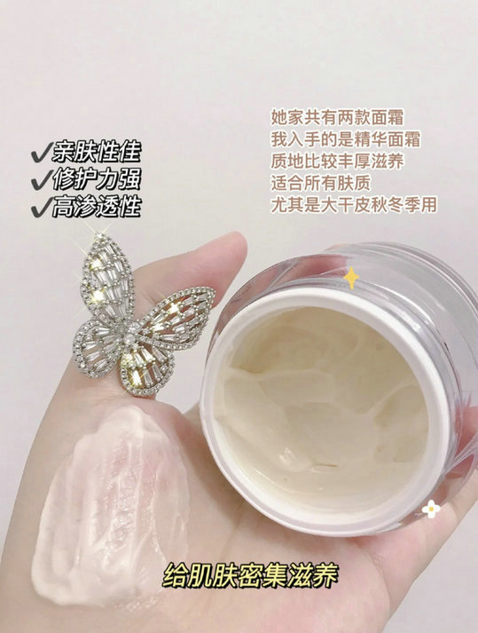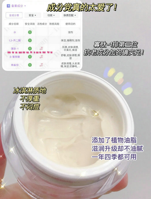 寡肽-1、类蛇毒肽、二肽简直就是抗初老的核心成分,能有效改善面部细纹、松弛、还能平滑细嫩肌肤!米色的奶酪质地,擦在脸上软软糯糯的因为冬天比较干,所以我晚上都是厚涂2层它吸收很快,我还会配合上一些按摩手法,更容易促进皮肤的吸收,提拉效果也会更好!!擦完脸软乎乎的!跟嫩豆腐一样,超级细腻很难有一瓶面霜这么惊艳了!