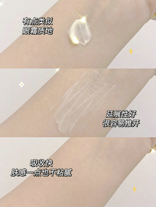 奶乎乎的芝士酱质地,看着有点黏稠,不过延展性很好,涂抹开后很快就吸收了,不用担心会闷痘,痘肌集美也可。