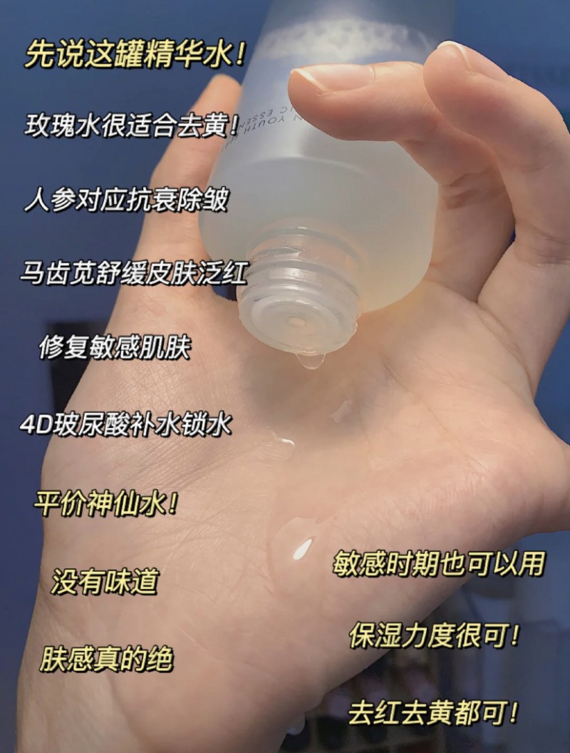 用过一段时间后做对比就会发现,皮肤没有之前这么缺水,皮肤问题也少了,一些比如熬夜后皮肤偏蜡黄,容易出现红血丝,还有换季期间频繁的闭囗爆痘,现在才知道用对一款精华水原来可以这么省心,成分很安全,敏感肌放心用,良心种草,推荐入手!
