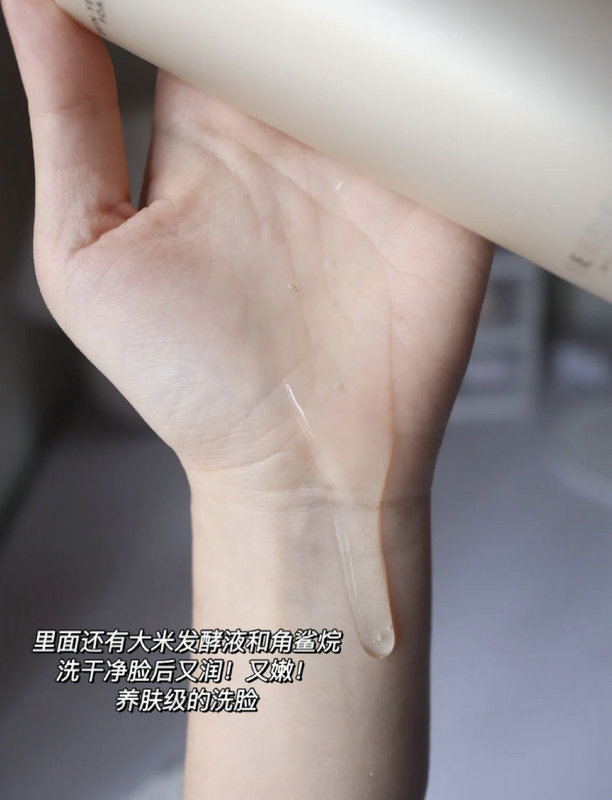 而且不会有紧绷感,因为里面有大米发酵滤液和角鲨烷,洗干净脸后又润,又嫩!养肤级的洁面啊~我妹妹是敏感肌用了也觉得很舒服。