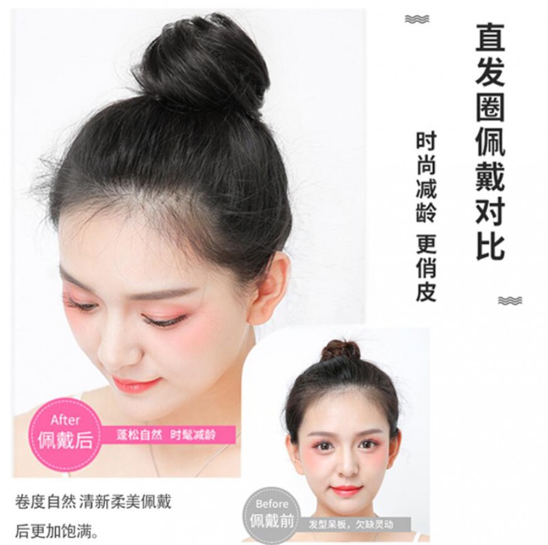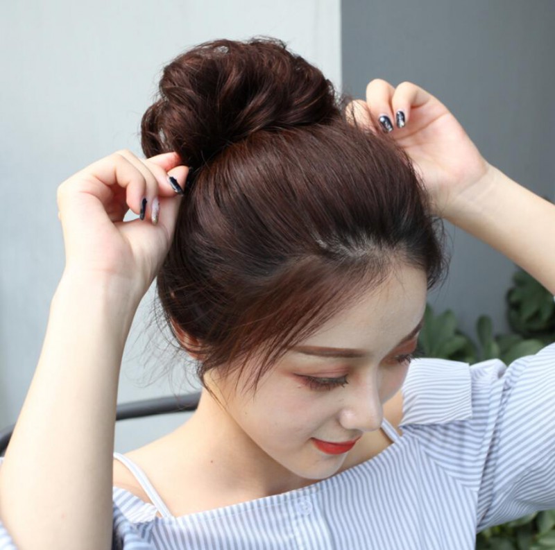 先用梳子将齐肩发梳理通顺,为下面扎发做准备。以耳朵里侧为分界线,预留出发丝来做刘海,其余头发分别撩至耳后。接着用手将脑后的头发梳理成高马尾辫。用橡皮筋将马尾辫扎好。然后把马尾辫沿着发根缠绕成蓬松丸子头,至发尾用黑色小发夹扎好。将准备好的发圈戴上,既起到固定丸子头的作用又可以让造型更加吸睛。