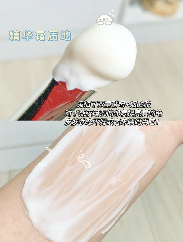 二合一的鸳鸯锅设计,一边是精华霜,质地水润不厚重,添加了二裂酵母和烟酰胺这种大牌成分提亮和维稳都做得很好。