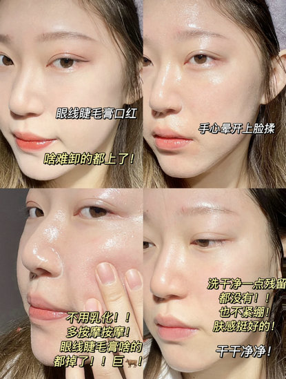 卸脸的时候我还在想会不会刺激皮肤,因为市面上的眼唇卸多少会有微微刺激感,敏感肌是不能用来卸面部的,但我这个担心多余了,隔天脸也没过敏,而且卸的贼干净,也不用乳化不用卸妆棉直接上脸揉就可以!