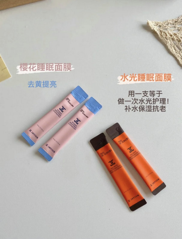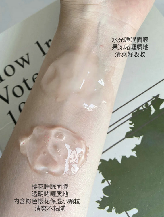 一共有两种:橙色的是水光睡眠面膜,就是用来日常补水每天都能用,特别是换季的时候我皮肤干到不行,晚上睡前涂上它之后第二天皮肤水当当的,起皮什么的跟我完全没关系了。我妆前也会厚敷一会上粉底都服帖。