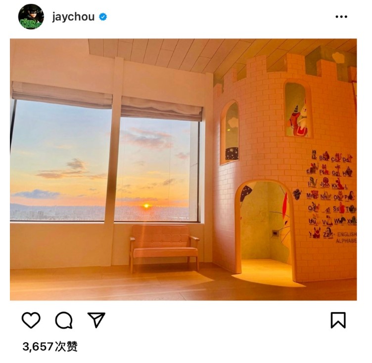 21日,周杰伦在社交平台分享给女儿小周周建的粉红色城堡,城堡外墙贴了字母表,内墙还有小兔子木马等图案,在夕阳下梦幻美好。周董透露城堡之所以是粉红色的,是“因为我也喜欢粉红色”,两个小公举。