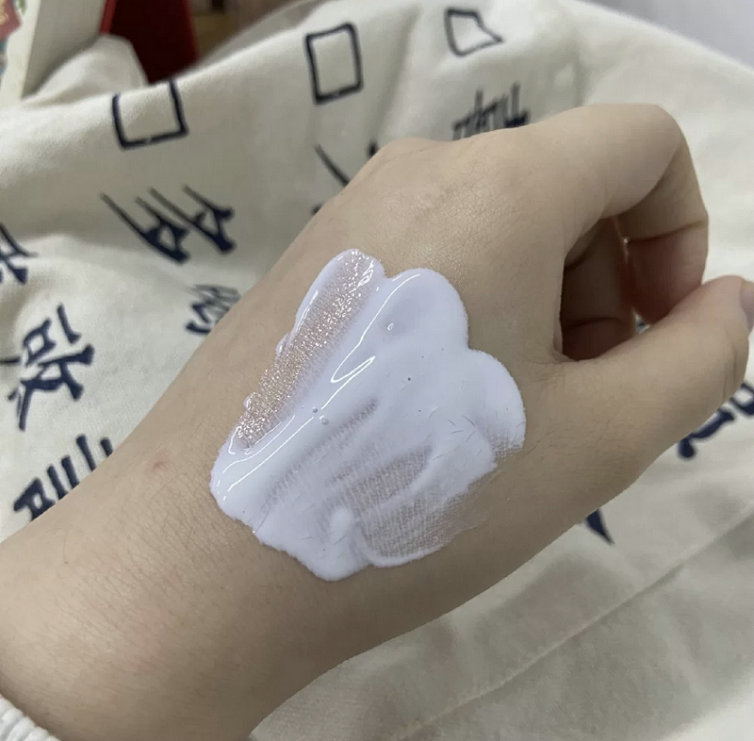 这是一款纯物理防晒,属于乳液质地,流动性和延展性都很好,也没有香味。推开的时候是乳白色的,很好推开,我刚开始用还以为会泛白,但是抹开之后发现没有颜色,成膜非常快。这个应该算是它最大的优点了。