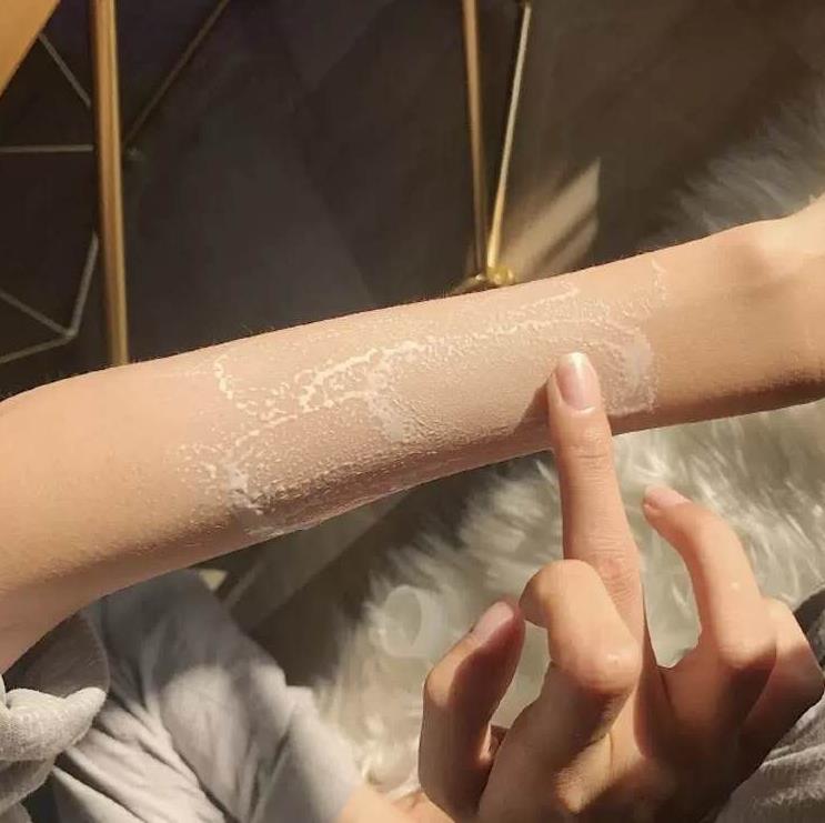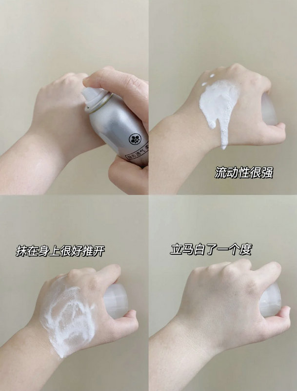 喷出来的泡沫,质地很轻薄,喷在身上很好推开,脖子立马白一个度,而且这个喷雾主要成分都是植物萃取的,所以可以放心上脸哦,图片拍的是手臂试色效果,看一下前后的对比,自然提亮,很不错。