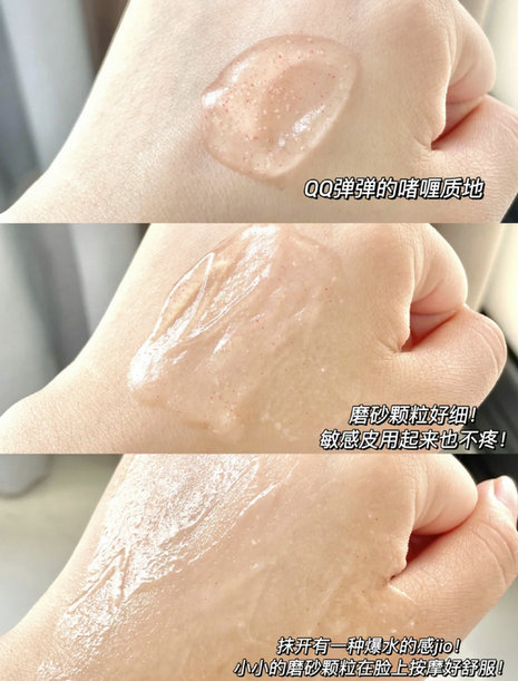 绵绵的果酱质地,花果香的味道超好闻,其实是荷兰的一个小众品牌格兰大地磨砂膏啦~蛮少见到这种水感啫喱的磨砂膏,抹开有一种爆水珠的感觉,而且对我这种干敏皮来说!这个颗粒猴猴猴猴细腻!