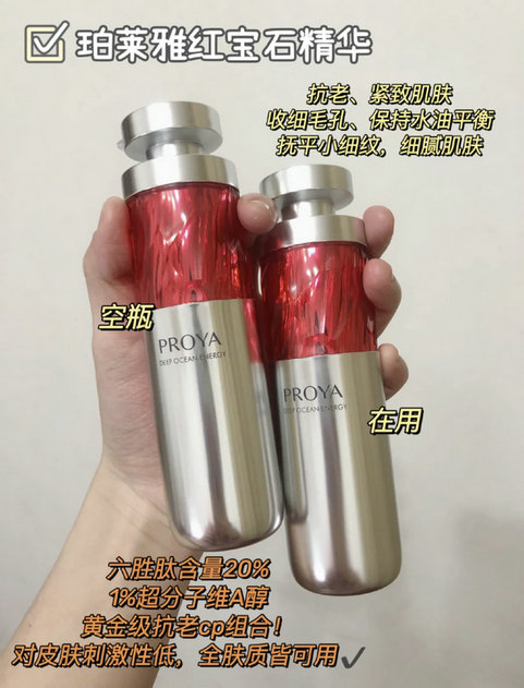 建议新手可以试试,性价比高的珀莱雅红宝石精华,含0.1%的a醇,刺激性小,稳定性高低浓度适合新手小白,不易脱皮过敏;还含20%六胜肽,贵妇精华也就舍得加到10%给大家科普一下,a醇+胜肽,黄金级抗老cp!!
