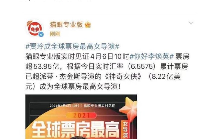 21世纪经济报道:【财经投投看:#你好李焕英票房超神奇女侠#,两部电影你pick谁?】据猫眼专业版数据,截至4月6日14时《你好,李焕英》累计票房超53.95亿,累计票房已超派蒂·杰金斯导演的《神奇女侠》(8.22亿美元),#贾玲成全球票房最高女导演#。你pick哪一部?了解更多