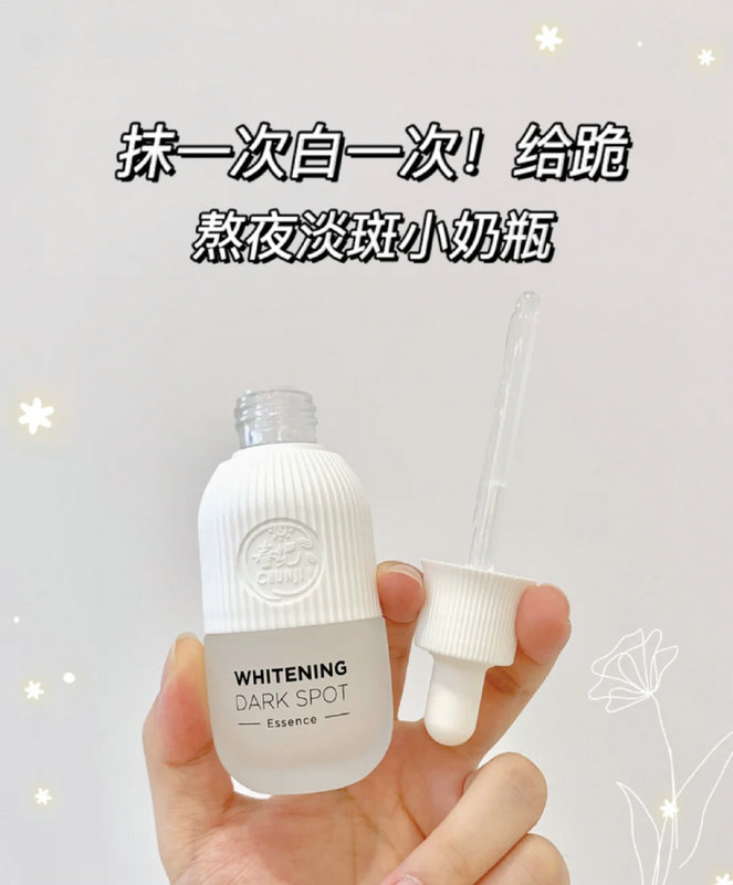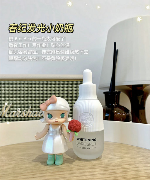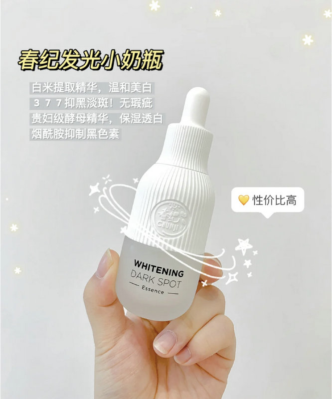 春纪发光小奶瓶它是今年推出的全新升级版美白精华,吴谨言代言的,这款是主打功效是淡斑美白,里面的377馨肤白成分+烟酰胺王英可以从根源处抑制黑色素的形成!