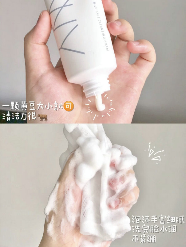 挤出来是乳霜质地,加水打圈,很细腻的小泡沫,如果喜欢丰富大泡沫的话,可以用起泡网,我比较懒,一般都是手搓起泡然后往脸上按摩。