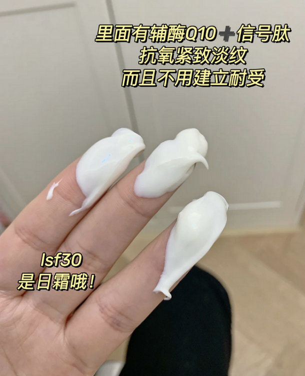 它里面有辅酶Q10+信号肽要知道这两个可是抗老界的扛把子!几十块钱买到也是很划算了呢!我自己用下来细纹啥的淡化了蛮多,而且肤色还提亮了蛮多不得不服气!!对了!这个面霜是日霜哦自带LSF30,我会一直回购下去的!!
