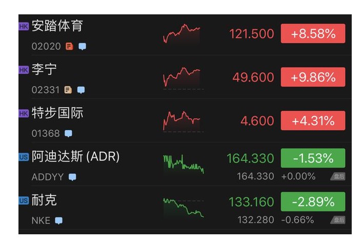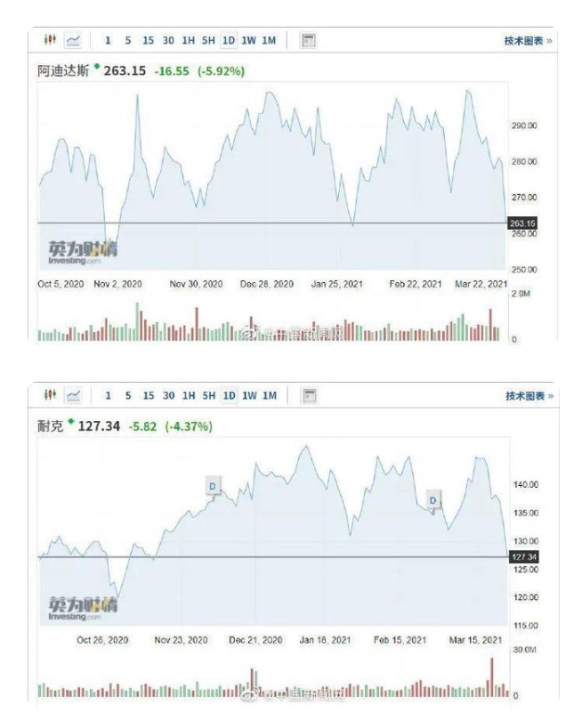 在昨夜美股反弹的情况下,耐克盘中跌近6%,最终收跌3.39%,单日流通市值蒸发约71亿美元(约合463亿元人民币);阿迪达斯3月25日在德国法兰克福交易所跌逾6.49%(美股ADR跌逾5%),单日流通市值蒸发约35亿欧元(约合270亿人民币);二者市值合计蒸发约733亿元人民币。